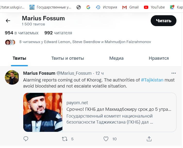 Ба гузориши сомонаи Паём, намояндаи Кумитаи норвежии Хелсинки Мариус Фоссум дар саҳифаи твиттерии худ аз макомоти Тоҷикистон хост аз ҳар гуна хушунат ва хунрезӣ дар Хоруғ пешгирӣ кунанд.