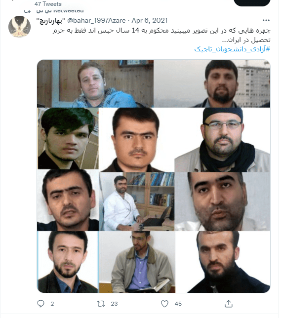 در تاریخ 12 آوریل سال 2021 در سایت «رادیو آزادی» گزارشی به این شرح منتشر شد که هشتگ «آزادی به دانشجویان تاجیک» که در دانشگاههای ایران تحصیل کردهاند، طی چند روز اخیر میان کاربران فارسیزبان شبکه «توییتر» مشهور شد. تنها در 7 آوریل، این نوشته را تقریباً 11 هزار بار توییت کردند